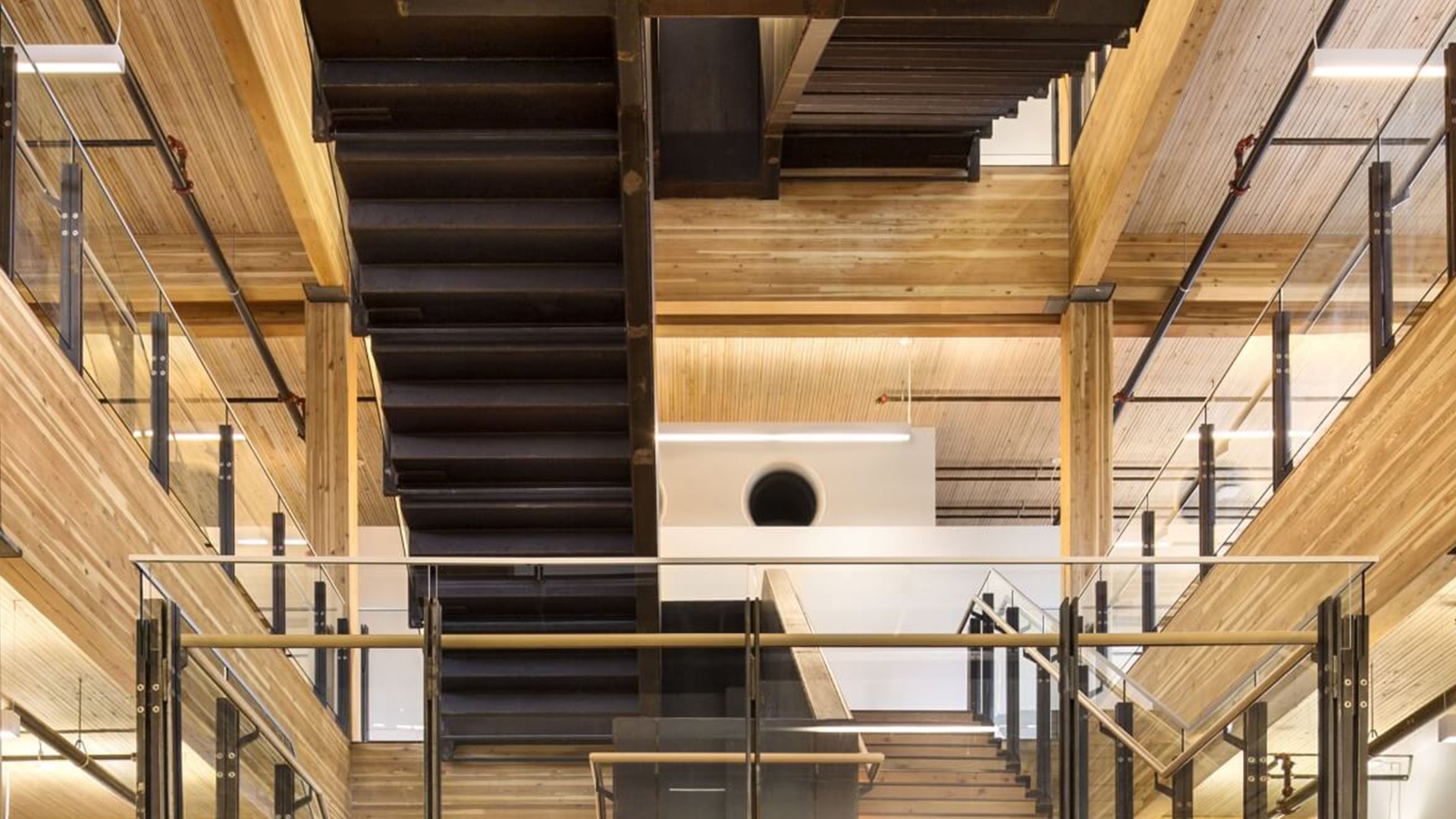 Photo : Plafond en bois massif-cloué et poutres en bois massif-collé au siège social de MEC, Vancouver, C.-B. , Ed White Photographics.