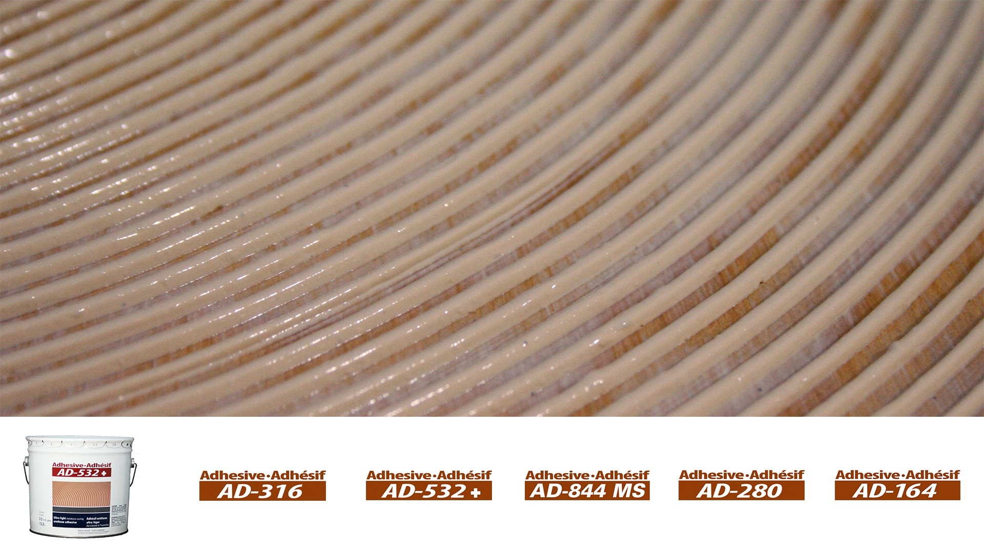 Un adhésif est un matériau qui permet de joindre mécaniquement ou chimiquement deux surfaces. Selon ce qui doit être assemblé, on utilisera différents types d’adhésifs. Les adhésifs sont classés de différentes façons selon leur origine ou encore selon leurs propriétés physiques et chimiques. Les adhésifs utilisés pour les revêtements de sol sont très nombreux, complexes et fabriqués synthétiquement. Un adhésif pour les revêtements de sol doit non seulement offrir une performance mécanique accrue pour maintenir le plancher collé au substrat, mais il doit aussi permettre l’expansion et le retrait du bois selon les conditions environnementales variables d’humidité et de température.